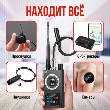 GG K19 – компактный детектор, который позволит вам быстро обнаружить скрытые камеры видеонаблюдения и подслушивающие устройства. Прибор работает в широком диапазоне частот от 1 МГц до 6.5 ГГц и способен детектировать практически любые модели жучков и мини-камер. Кроме того, устройство обнаруживает сигналы GSM, Wi-FI, Bluetooth и GPS. Дополнительно в комплект входит сканер магнитного поля для поиска GPS-маяков на транспортах средствах.