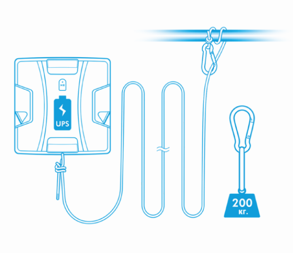 Встроенный ИБП (источник бесперебойного питания) предотвращает падение робота. Алгоритм управления с защитой от падения, автоматически обнаруживает препятствия и оконные рамы. Высокая прочность страховочного шнура (200 кг).