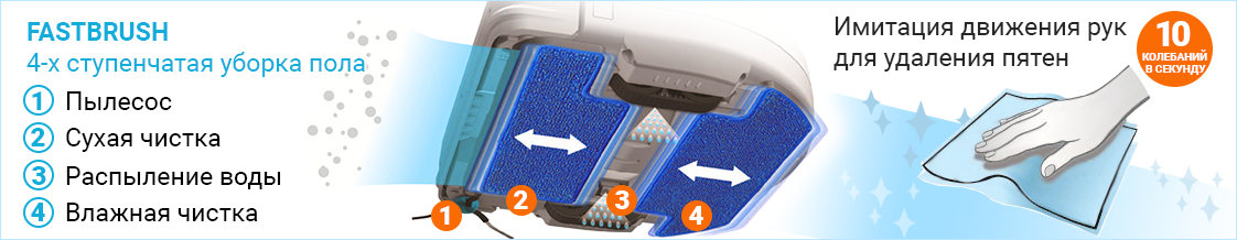 Великолепное качество очистки достигается благодаря запатентованному способу мойки пола – FastBrush. Сначала робот пылесосит, затем оттирает грязь сухой салфеткой, третья стадия - распыление воды, и в заключение он вытирает остатки салфеткой, которая также полирует пол. Моющий робот пылесос совершает 10 колебаний в секунду и имитирует движения рук при натирке пола.